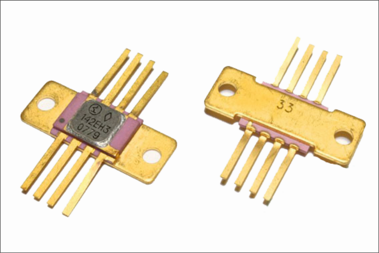 Микросхемы серии 142ЕН и подобные, 8 больших позолоченных выводов, с радиатором.